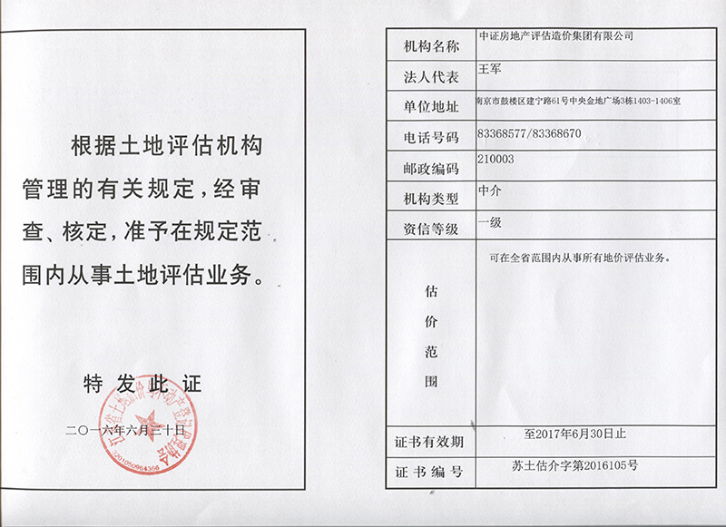 土地估價江蘇省一級資信證書 2018-05-29 17:26:44